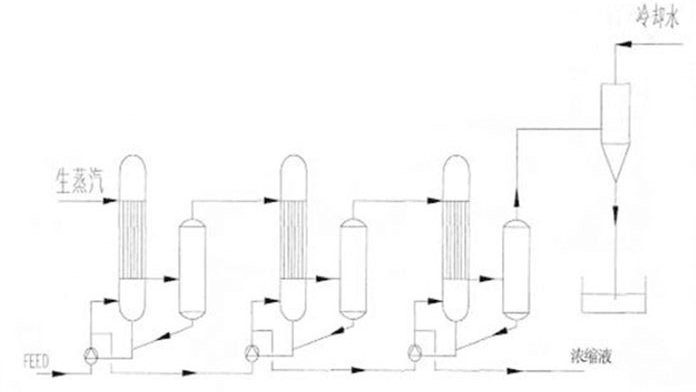 (2)逆流法:被蒸发的物料与蒸汽的流动方向相反,主要用于进料温度较低,但出口温度较高的工艺情况。进料无需预热或少许预热,节约了蒸汽用量,但整个过程需要用泵来输送物料,增加了用电量。